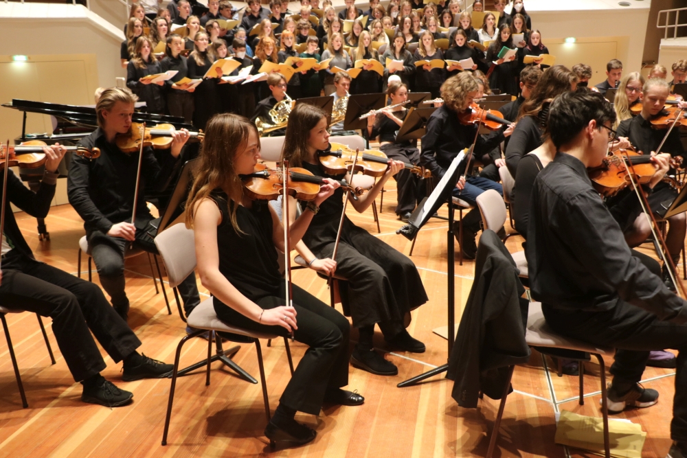 Beeindruckende Soli schon bei den Jüngsten in der Smallband, abgeklärte Sängerinnen und Instrumental-Soli in der Bigband, durchweg bewegende, große Chöre, berührende, klassische Klänge auf den Instrumenten und zum Schluss mitreißende Filmmusik bei der Bigband sorgten für Abwechslung, Unterhaltung auf höchstem Niveau und Gänsehaut. Das Publikum stimmte begeistert und klangstark sowohl in die Chorbeiträge vor der Pause als auch in den gemeinsam mit allen gesungenen Abschlusskanon „Dona nobis pacem“ mit ein.