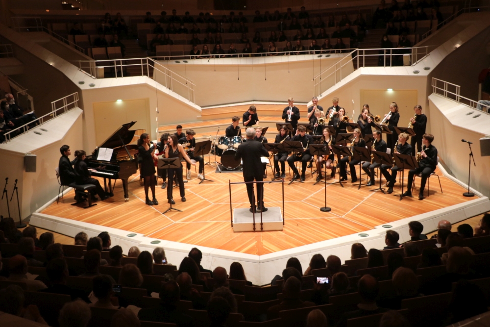 kurz gesagt: alle Musik-AGs außer dem Chor der 7. Klassen (welcher lediglich aufgrund seiner Größe und der damit zusammenhängenden Zuschauerbeteiligung nicht mit auf die Bühne durfte) haben den Kammermusiksaal der Philharmonie zum Klingen gebracht.