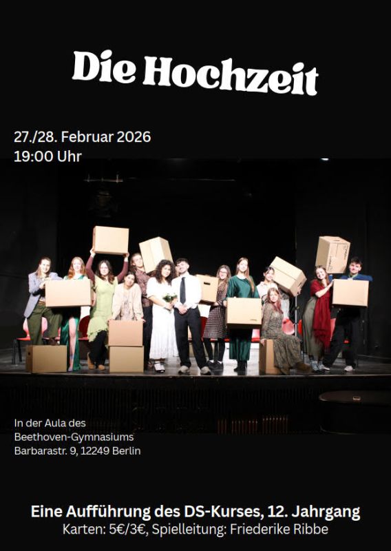 Herzliche Einladung! Endlich ist es soweit: Der DS-Kurs des 12. Jahrgangs unter der Leitung von Friederike Ribbe „traut sich“ und freut sich auf eine fröhlich-bunte-emotional-aufregende-berührend-bewegende Hochzeit. Seid dabei, wenn es aus vollem Herzen heißt: Ja, ich will!